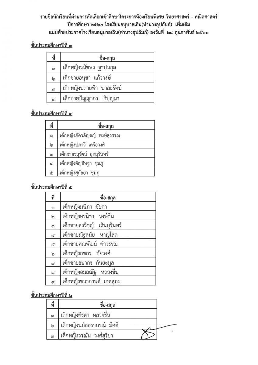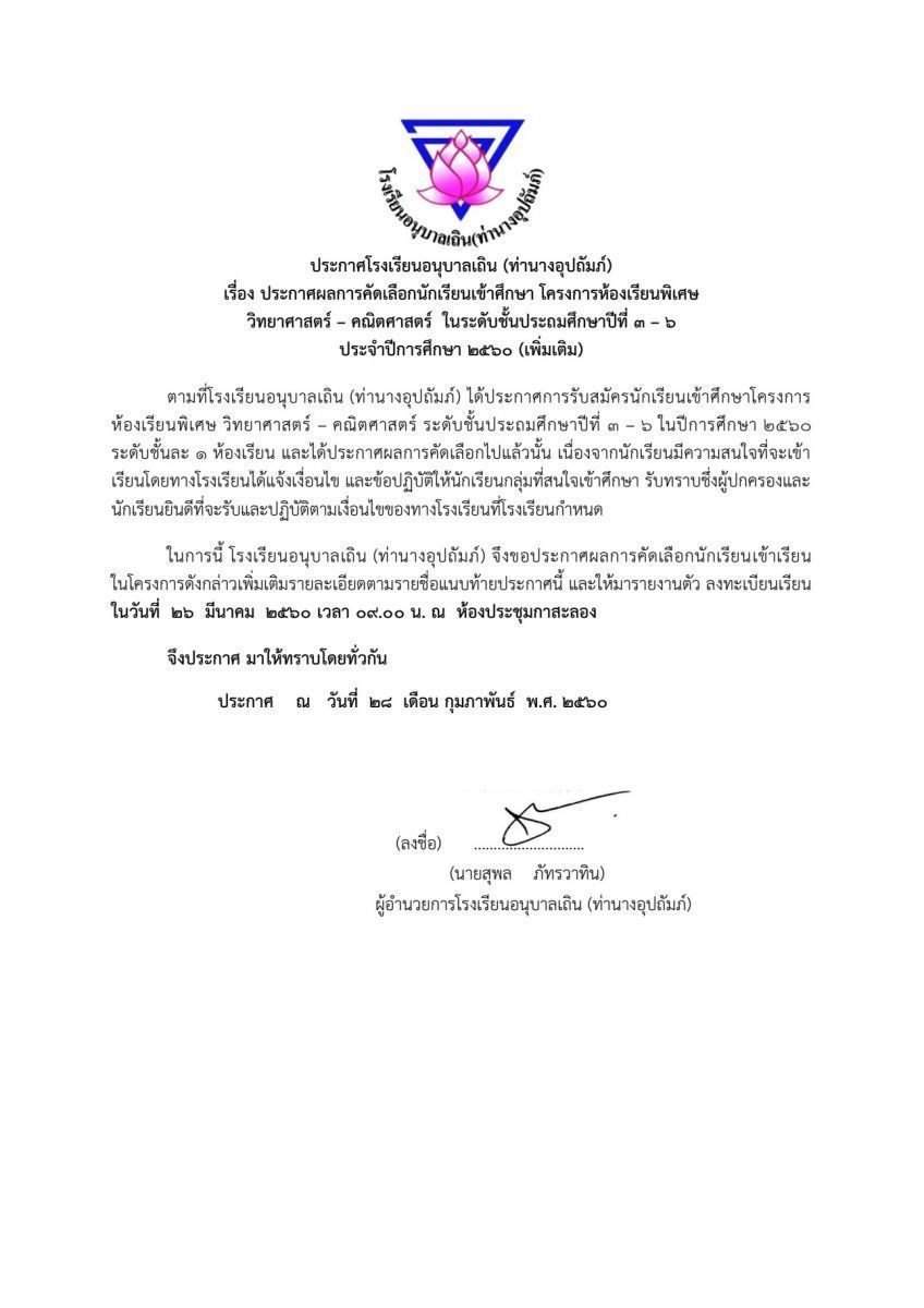 ประกาศผลการคัดเลือกนักเรียนเข้าศึกษา โครงการห้องเรียนพิเศษ วิทยาศาสตร์ คณิตศาสตร์ ในระดับชั้นประถมศึกษาปีที่ ๓ ถึง ๖ ประจำปีการศึกษา ๒๕๖๐ (เพิ่มเติม)