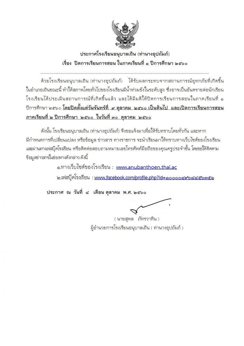 ประกาศ ปิดการเรียนการสอน ในภาคเรียนที่ 1 ปีการศึกษา 2560 เนื่องจากสถานการณ์น้ำท่วม